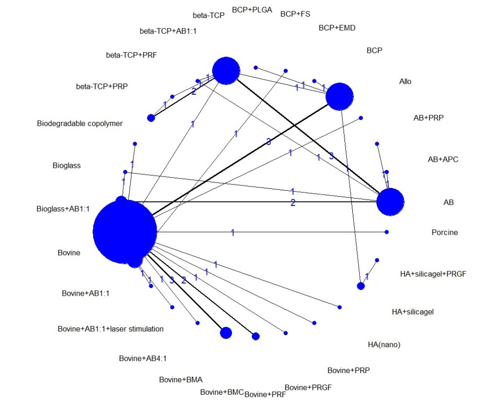 34 RCTs (842 maxillary sinus augmentations) with an average healing period of 5–8 months were included in the NMA. 31 were two-arm studies, and 3 were three-arm studies.