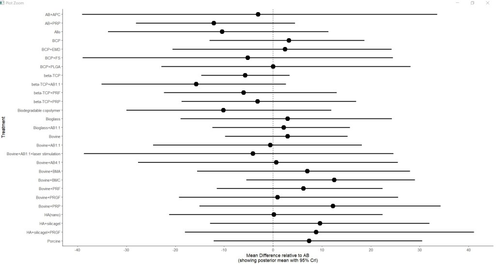 From the 376 pairwise comparisons, no significant differences were detected, leading to a rejection of the null hypothesis that AB alone is the most favourable material for bone regeneration.