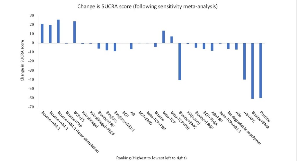 To explore this further, the simplest method was to undertake a sensitivity meta-analysis and remove those studies considered to be at high risk of bias. These studies would be the most likely to result in misleading results (Chaudhry et al., 2015). The 9 papers the authors considered to be a high risk of bias were removed from the NMA database, and 2 further papers that appeared to share a control group. The rankings were then recalculated and presented alongside the original ranking data to observe any changes. The reanalysis removed 3 treatments from the ranking (autogenous bone plus autologous platelet concentrate, bovine plus bone marrow aspirates, and porcine bone), plus bone marrow concentrate was dropped 18 places from 81% to 40%. The top five highest-ranking treatments now include bovine bone mixed with autologous bone, bovine bone plus platelet-rich fibrin (PRF), and biphasic calcium phosphate (HA/β-TCP = 60/40) combined with fibrin sealant (FS). (Table 1.)